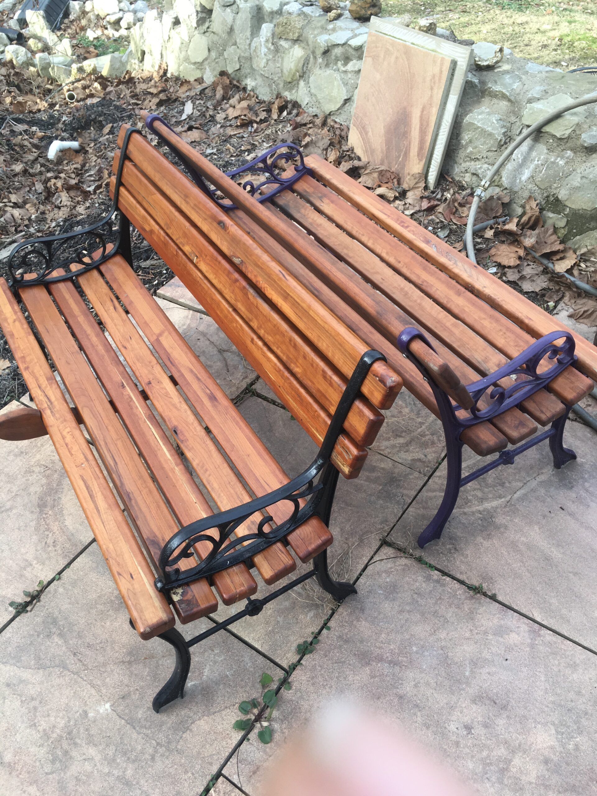 The “cherry iron benches” are made of solid cherry planks I made from logs on my property. The iron pieces in these benches are of historic origin.