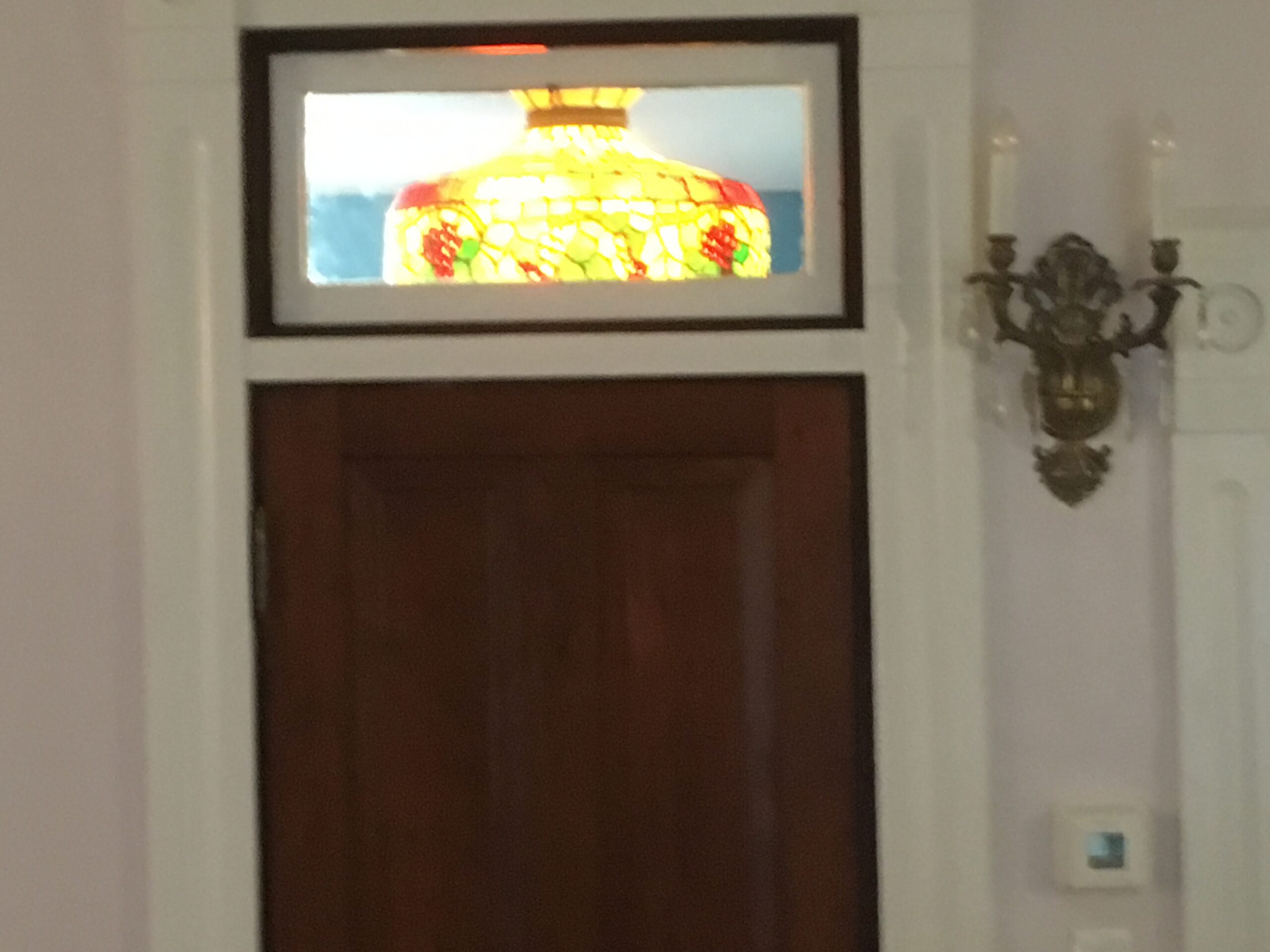 There is also a jigsaw corner table I made from solid cherry, along with a door transom featuring a stained glass fixture and a brass sconce in a doorway. Both were constructed from antiques for our renovated historic house in Linton.